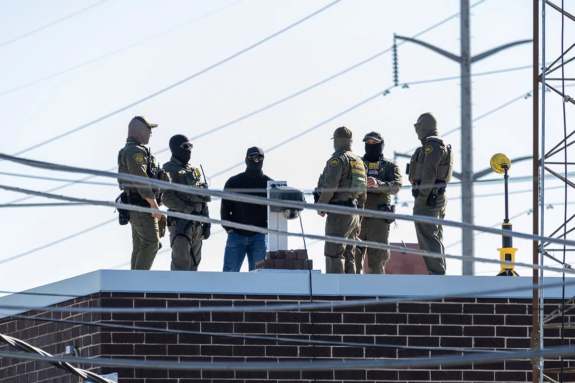 Several men in U.S. Border Patrol uniforms stand on the roof of an immigration processing center in Broadview, Illinois on Oct. 9. (Capitol News Illinois photo by Andrew Adams)