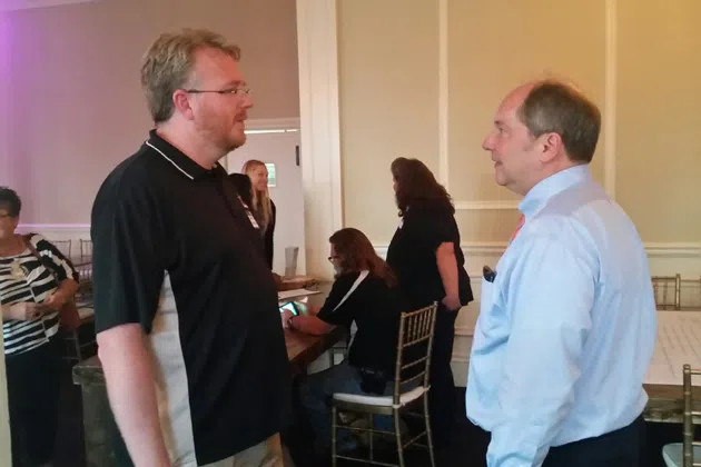 Owner of Red Raccoon Games and Kelly’s Bakery & Cafe Jamie Mathy (left) speaks with Community Development Director Tom Dabareiner (right). (Adam Studzinski/WJBC) By Adam Studzinski BLOOMINGT...