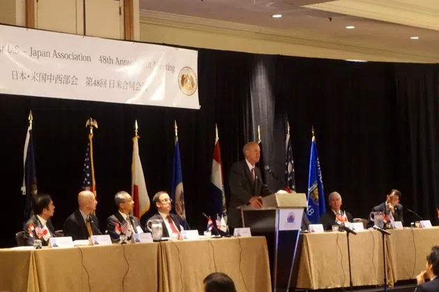 Gov. Bruce Rauner (standing) is attending the Midwest U.S.-Japan Association Conference in St. Louis. (Photo courtesy Facebook/Bruce Rauner/) By Greg Bishop/Illinois Radio Network ST. LOUIS – Go...