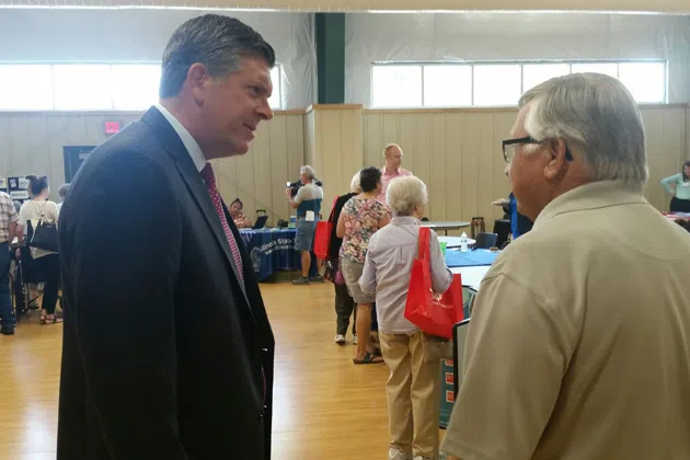 U.S. Rep. Darin LaHood (left) spoke with seniors at the event. (Adam Studzinski/WJBC) By Adam Studzinski NORMAL – Some local elected officials held a senior citizen resource fair Thursday mornin...